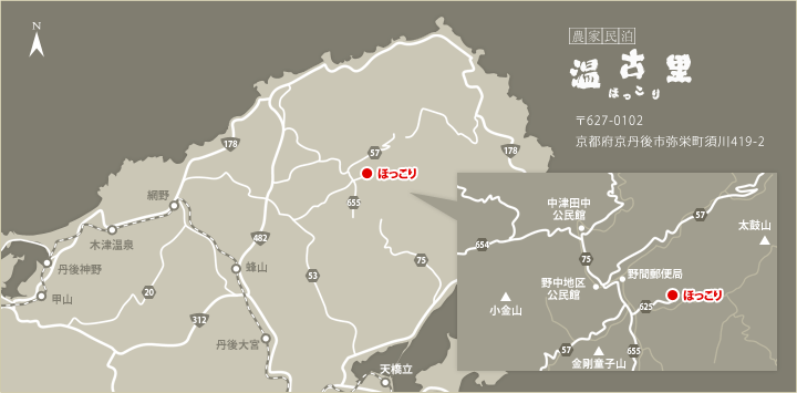 | 所在地 | 〒627-0102 京都府京丹後市弥栄町須川419-2 (施設内 TEL 0772-66-0218) ※カーナビには0772-66-0218の電話番号を入力してください。 |