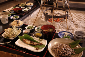 打ったばかりの蕎麦と、アマゴの甘露煮に山菜の天ぷら天然ヒラタケの吸い物。 蕎麦打ち体験も出来ます。自分で打った蕎麦をいただくのもオツかも?