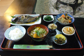 アマゴの塩焼きにシシ肉、アマダイ・あじ・イカ・サザエ、無農薬の自家製野菜で作った素朴な家庭料理、自家米で作った「どぶろく」でゆーっくり、のーんびり…。